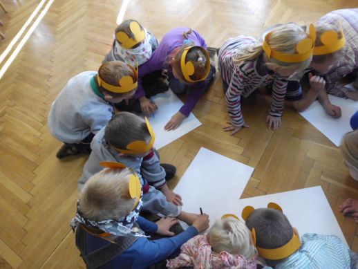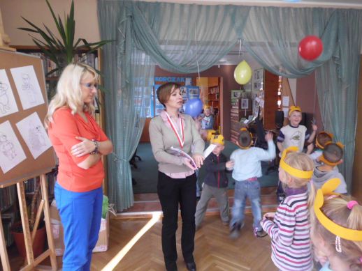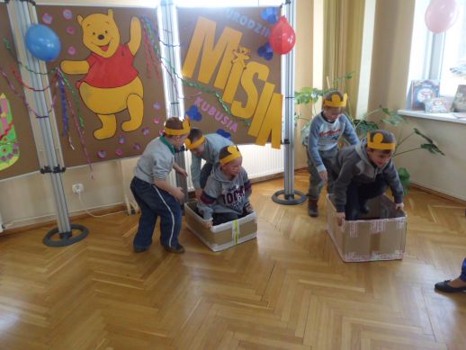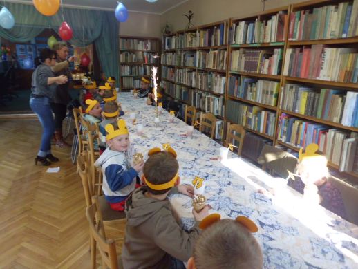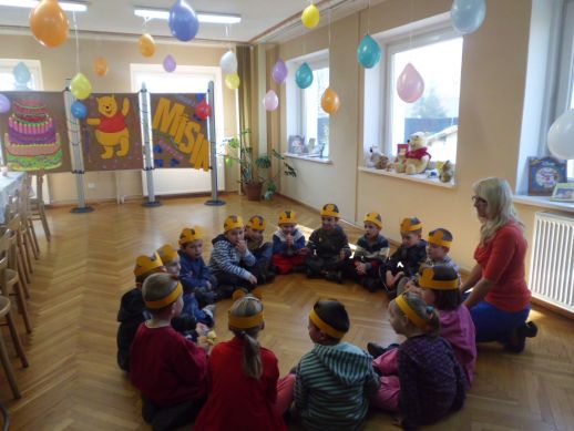 Nie zabrakło głośnego czytania fragmentu jednej z przygód Kubusia Puchatka, ponieważ rozbudzenie zainteresowań czytelniczych stanowi podstawowy cel " spotkań z książką". Wszyscy razem, bawiliśmy się w zabawę " Stary niedzwiedź mocno śpi". Wydawałoby się, że to już koniec niespodzianek, a tu okazało się, że w kąciku poświęconym pluszowemu misiowi, czeka na nas Kubuś Puchatek, który zaprosił nas na małe co nieco, czyli pyszne lody, oraz inne misiowe przysmaki, gdy już wszyscy się poczęstowali na koniec zrobiliśmy sobie pamiątkowe zdjęcia, przekazaliśmy dzieciom dyplom i medal - Honorowego Przyjaciela Kubusia Puchatka.Wszystkim dzieciom i opiekunom serdecznie dziękujemy za udział.