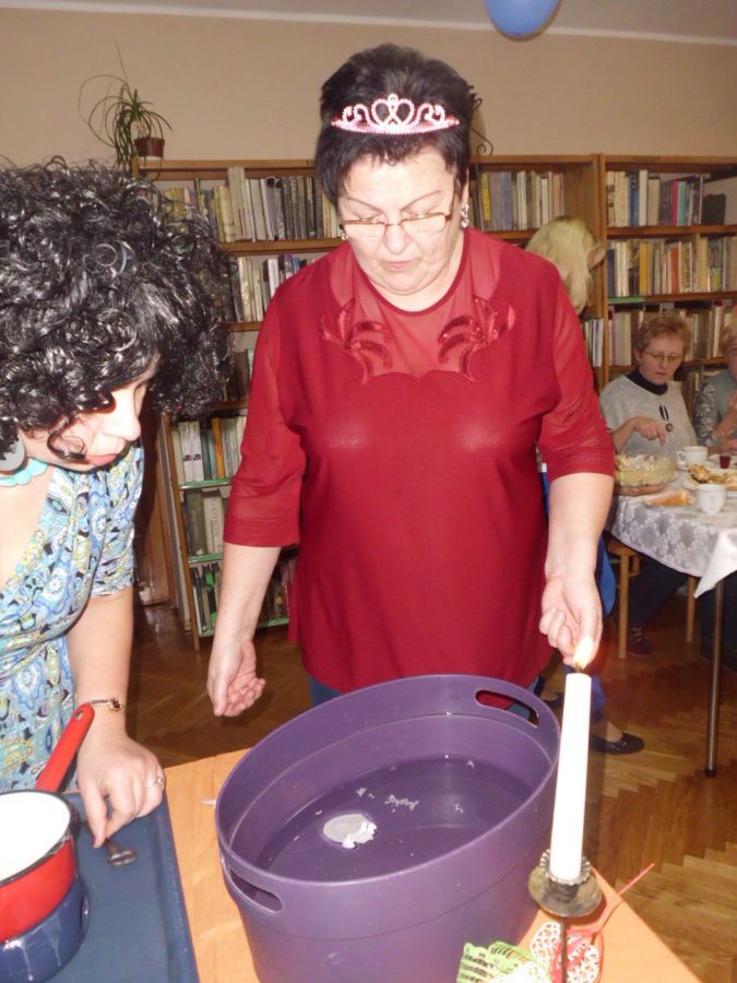 Seniorzy przy pomocy wróżki Urszuli, wykonywali najbardziej popularną wróżbę - lanie wosku. Wróżka miała pełne ręce roboty, ponieważ każdy chciał skorzystać z wielu przygotowanych wróżb. Atrakcją spotkania był poczęsunek przygotowany przez gości uczestniczących w zabawie. Dziękujemy za wspaniałą zabawę!